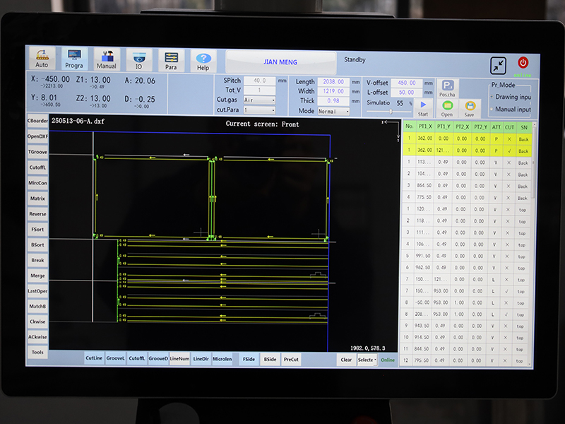 Jianmeng dikey ve lazer kombinasyon makinesi, 120 m / dakika'ya kadar bir oluk kesme hızı ve ± 0,02 mm'lik bir tekrarlanabilirlik doğruluğu ile paslanmaz çelik ve alüminyum alaşımı gibi çeşitli levhalarla uyumludur. Hidrolik otomatik sıkma sistemi, tek tıklama programlama ile 21 inç endüstriyel dokunmatik ekran, verimli ve hassas önceden bükme işleme yardımcı olur.